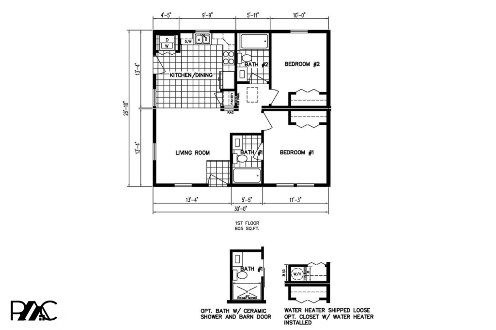This 805 sq. ft. modular built floor plan reflects a cottage-style ranch home, ideal for small families, couples, or retirees seeking an efficient yet comfortable living space. The layout includes 2 bedrooms and 2 bathrooms, maximizing convenience in a compact design.